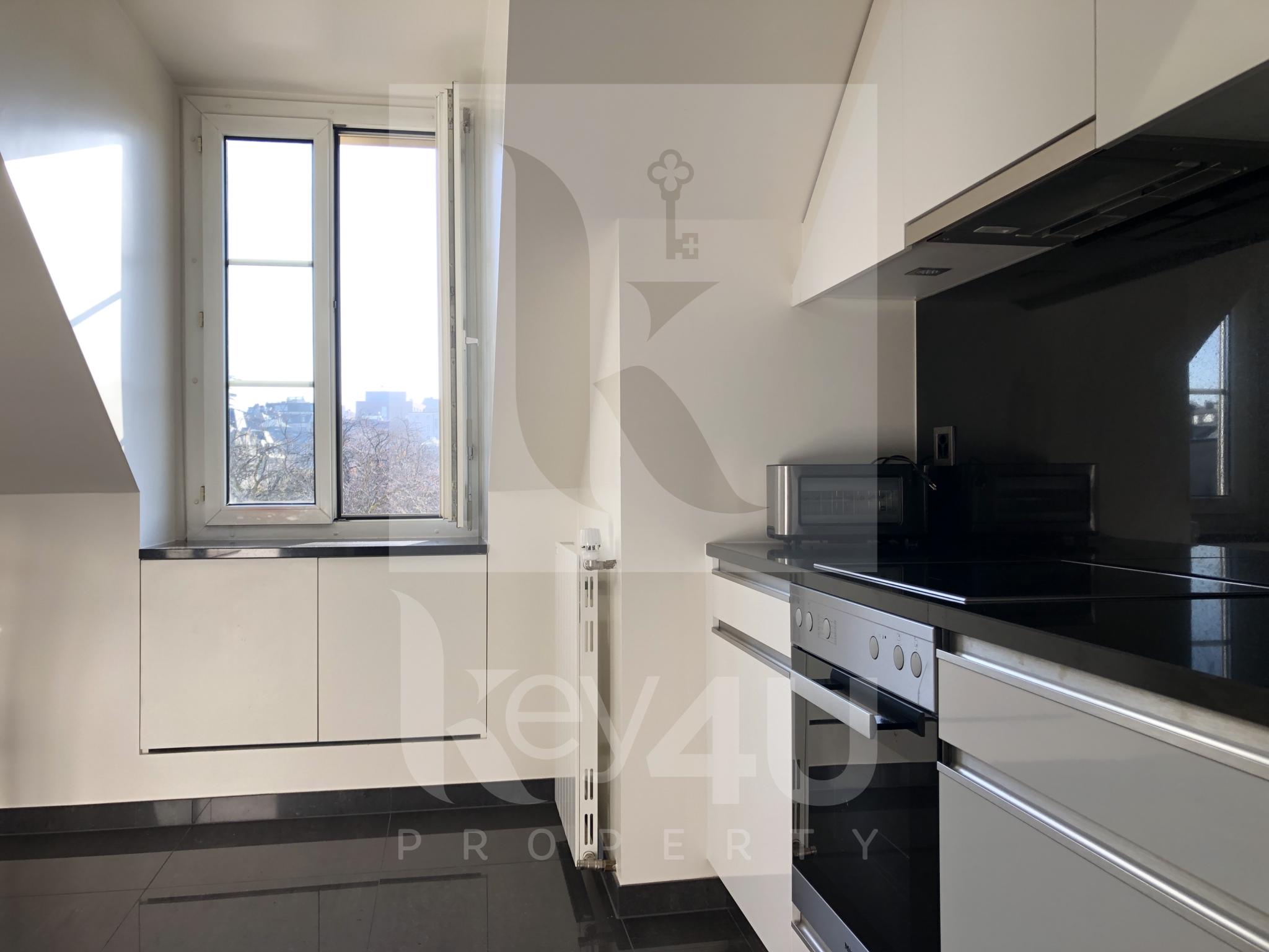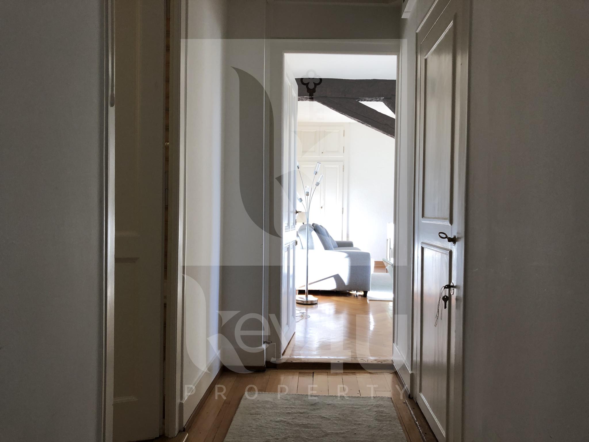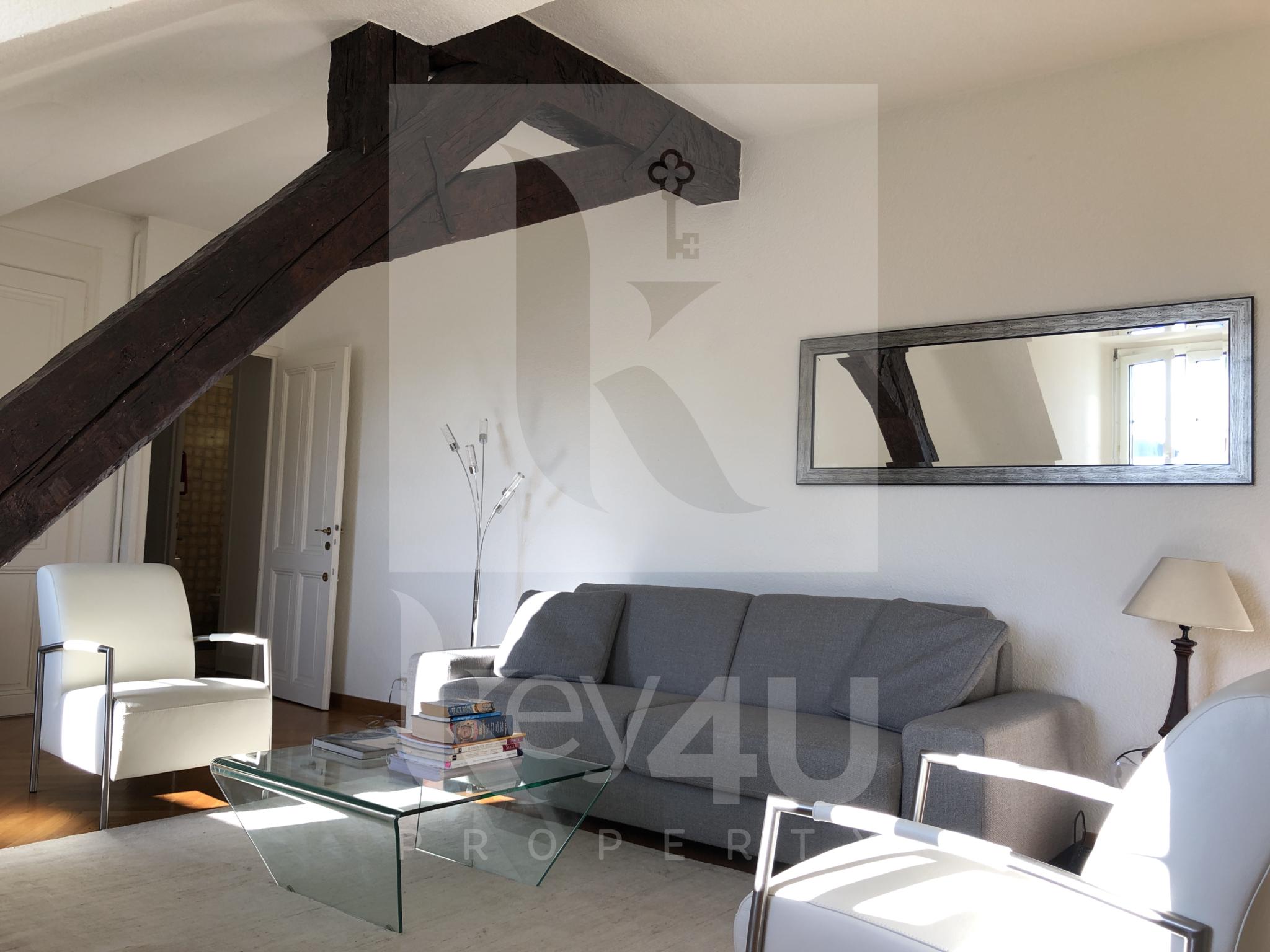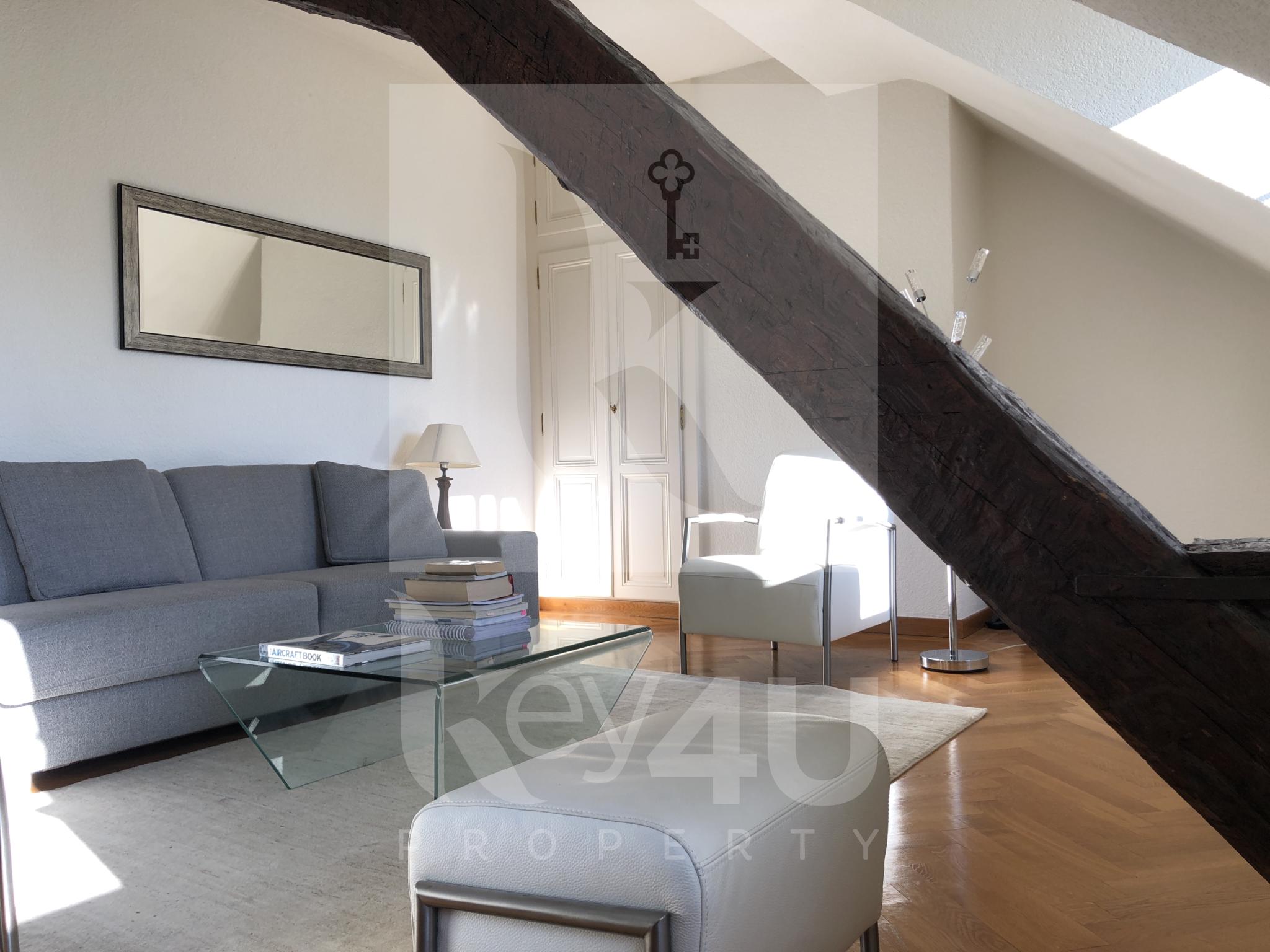 Situé au 4ème étage d'un immeuble prestigieux du XIX ème siècle, hautement sécurisé, ce bel appartement meublé, spacieux et lumineux bénéficie de belles poutres apparentes et offre une surface habitable de 50 m2.