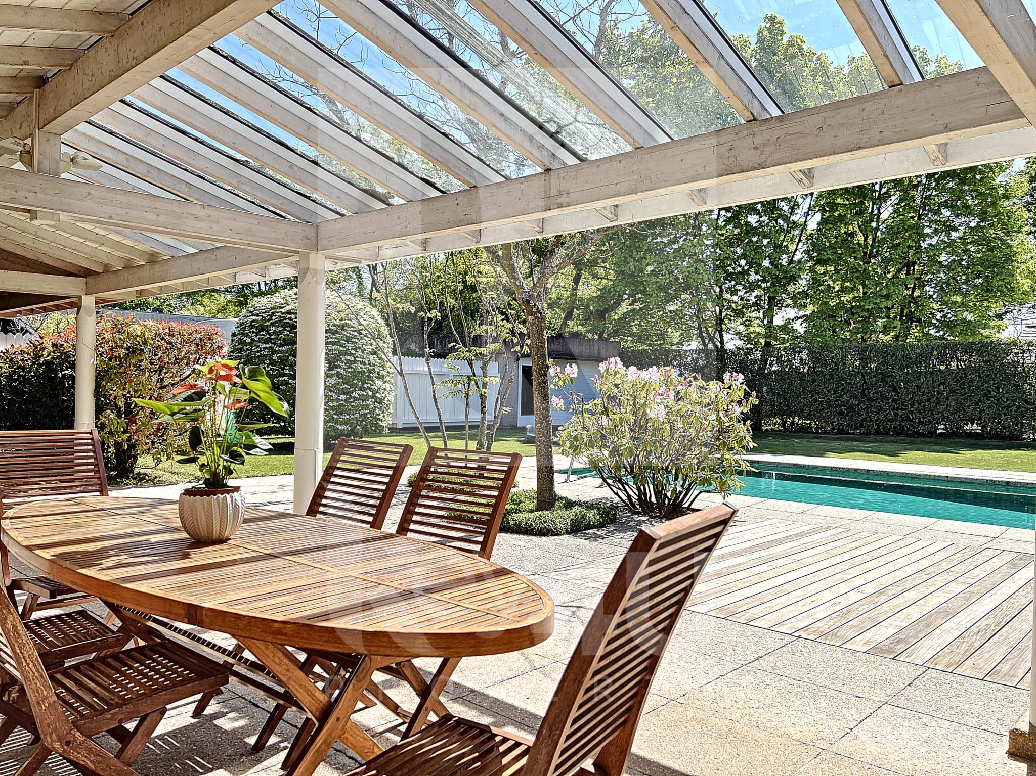Cette propriété se complète par une belle piscine, un pool house, un sauna, un garage fermé pour 3 voitures et des places extérieures.