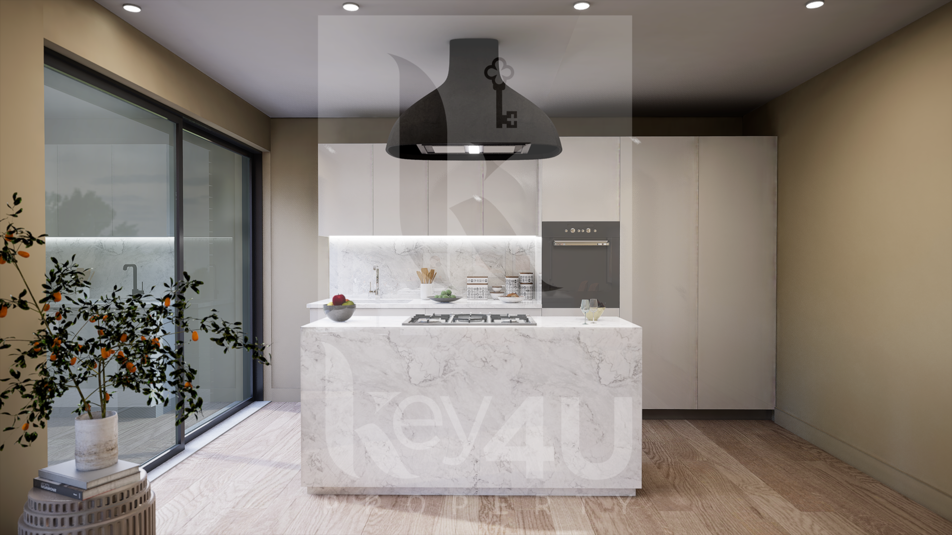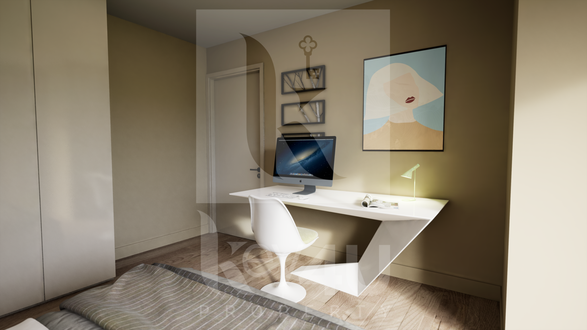 • La cuisine, entièrement équipée (aménagement au gré du preneur) peut être située à la place du studio et fermée ou ouverte sur le salon. A choix.