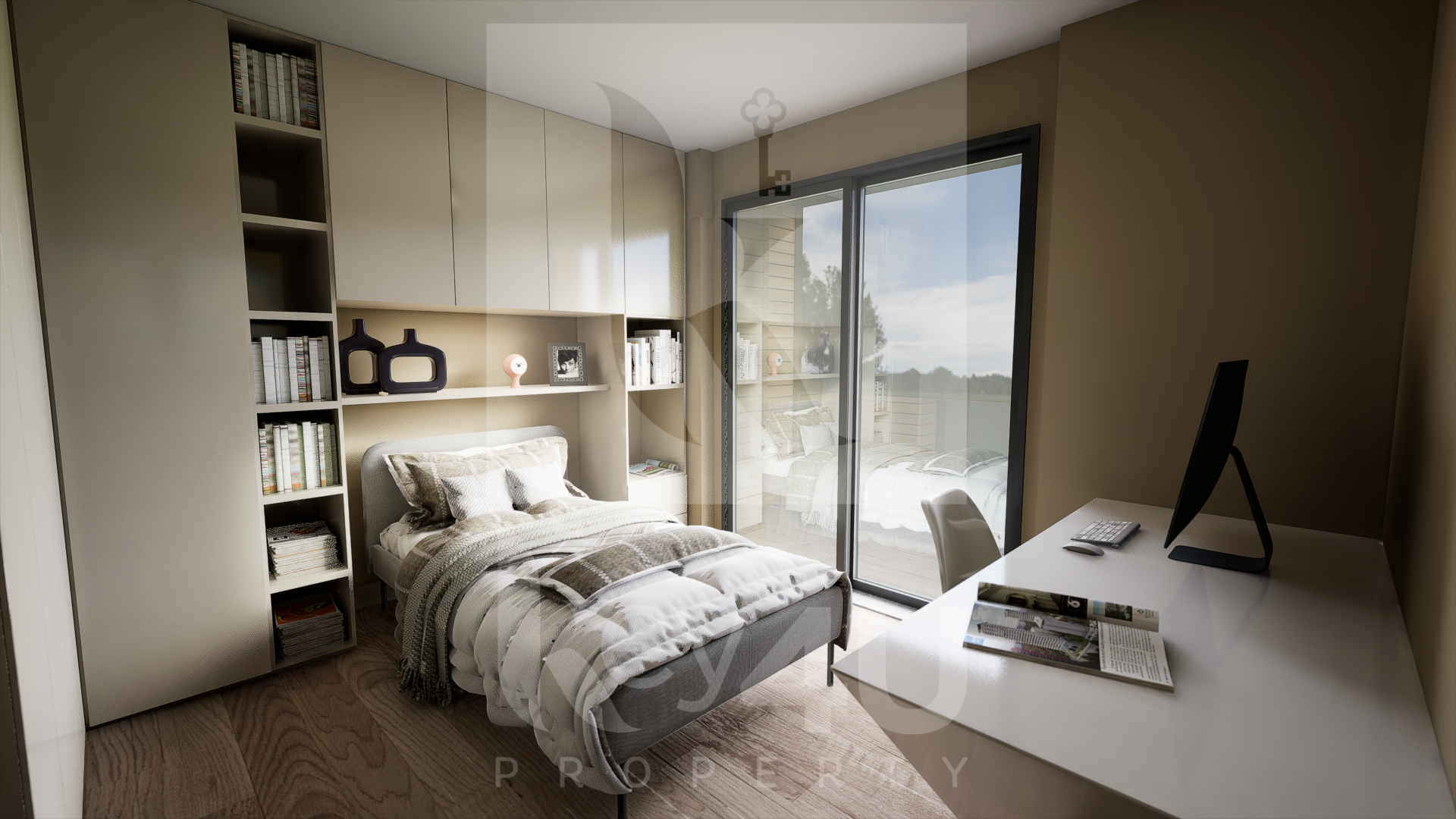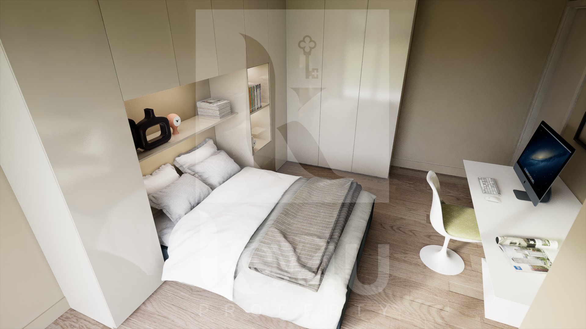 • Cette chambre comporte un dressing composé de deux armoires sur mesure et aussi d'armoires encastrées.