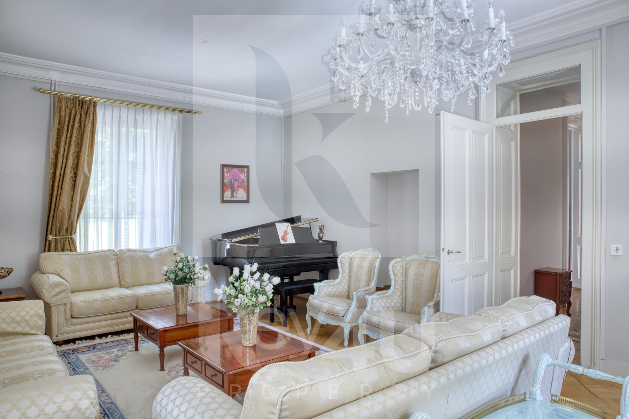 Le rez-de-chaussée se compose de pièces en enfilade de haut standing, avec moulures, belle hauteur sous plafond et parquet mosaïque d'époque.